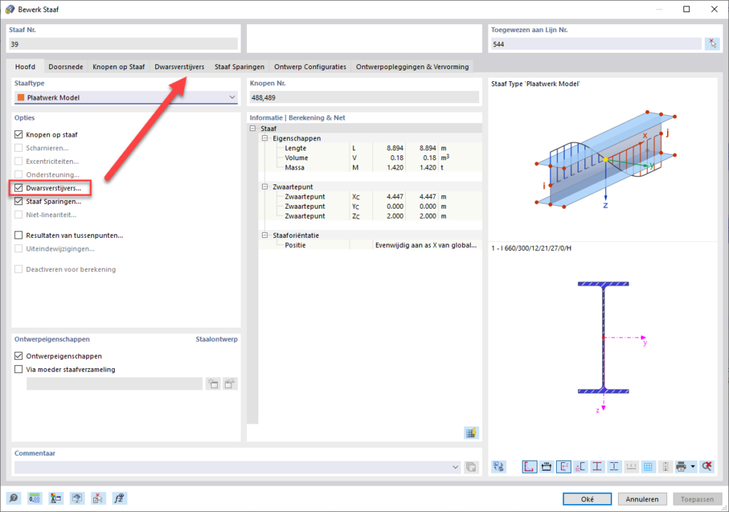 Om (Dwarsverstijvers) op de staaf toe te passen, kiest u de actieve 'Dwarsverstijvers' en vervolgens de gewenste verstijvingen met verschillende opties.