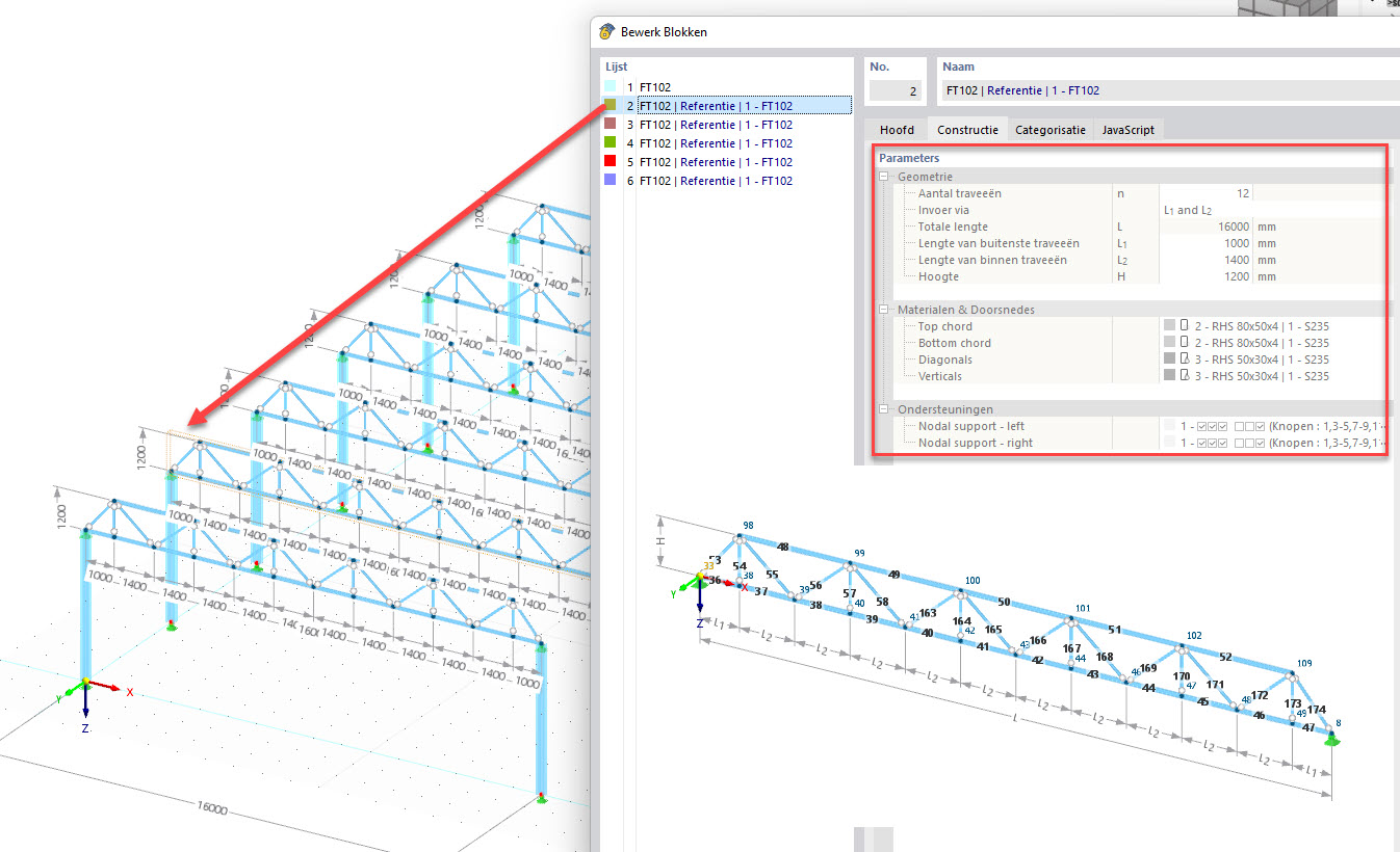 Gebruik referentieblokken in RFEM 6 | RSTAB 9. Deze blokken verwijzen naar een master blok en volgen de door een script aangemaakte geometrie.