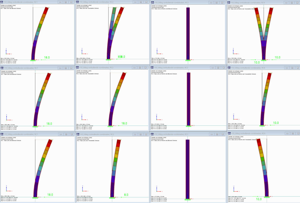 De resultaten van de omhullende combinaties RC1 t/m 4 zijn als volgt: van links naar rects: RC1, RC2, RC3, RC4